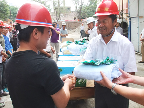 夏日炎炎,一線職工們的生產(chǎn)生活情況始終牽掛在甘肅建投領(lǐng)導(dǎo)們的心頭。8月上旬,甘肅建投副董事長、黨委書記宋忠慶,黨委副書記、紀委書記張育謙,工會主席尹克云等領(lǐng)導(dǎo)同志深入一線施工現(xiàn)場,看望了奮戰(zhàn)在烈日酷暑下的一線干部、職工群眾,并為他們送去了茶葉、毛巾等防暑降溫用品,給他們送上一份份“清涼”的問候。