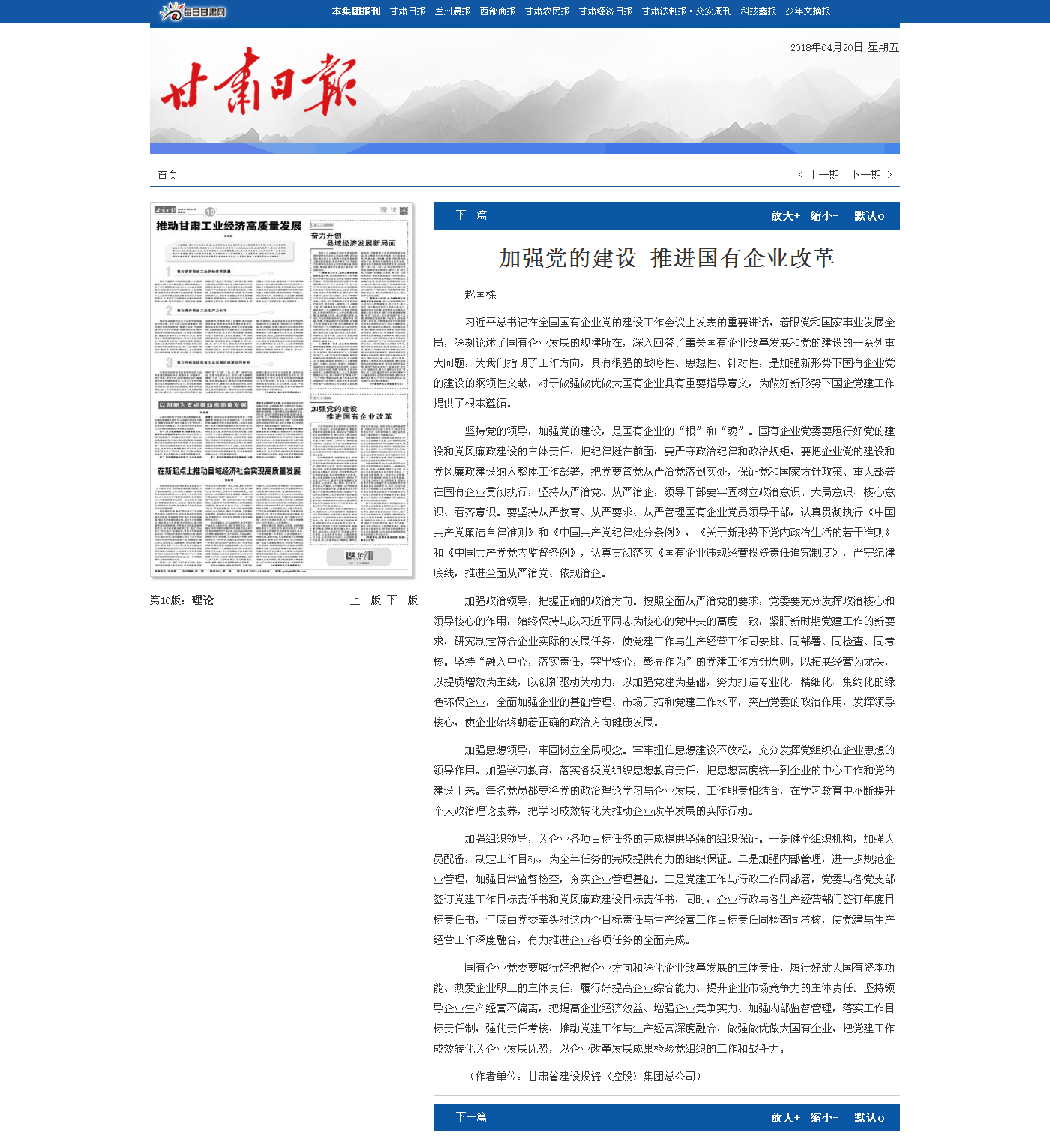 甘肅日報:加強黨的建設(shè) 推進國有企業(yè)改革