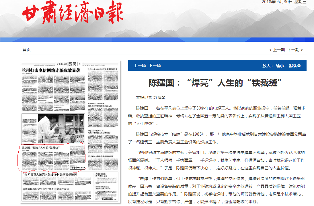 甘肅經(jīng)濟(jì)日?qǐng)?bào):陳建國(guó):“焊亮”人生的“鐵裁縫”